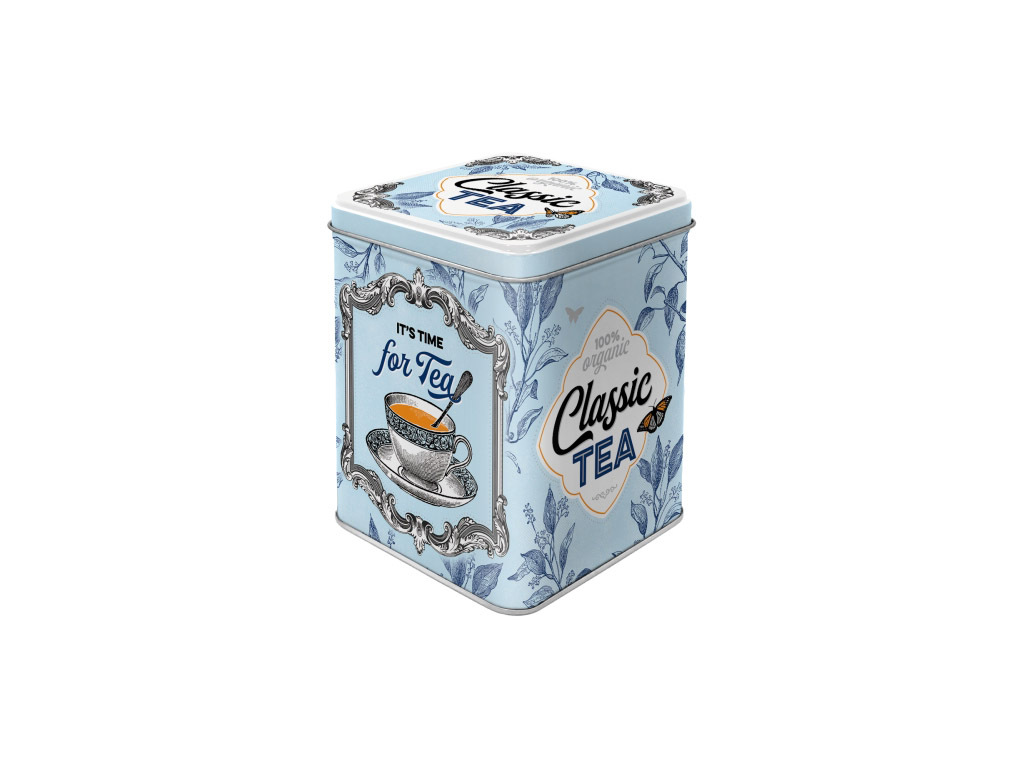 Retro plechová dóza na čaj s textem je originální dekorace.