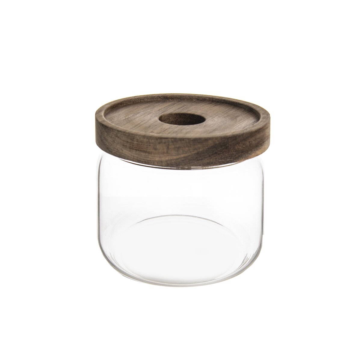 Dóza s víčkem s těsněním na uskladnění potravin. Zachová aroma i chuť vložených potravin. Materiál: borosilikátové sklo, akáciové dřevo, silikon - těsnění. Rozměry: objem 0,5 l, pr. 10 cm, v. 8,5 cm. Do myčky je vhodná pouze skleněná část, není vhodná do MVT. číst celé