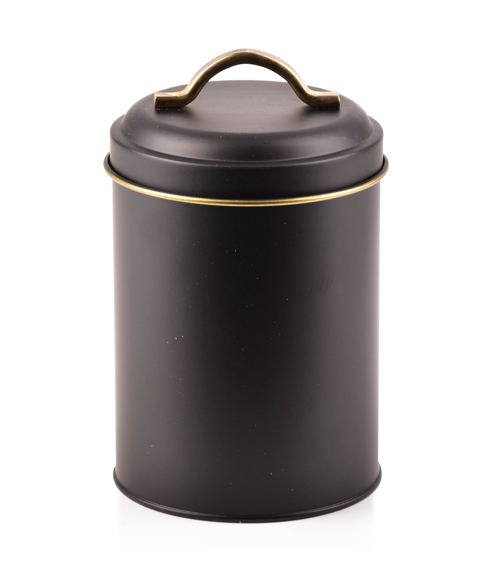 Metalowy pojemnik z serii SANDY BLACK marki COOKINI. Posiada złotą przecieraną obwódkę. Uchwyt w kolorze postarzanego złota. Idealna do przechowywania sypkichprzypraw lub ziół. DŁUGOŚĆ 11,00 cm SZEROKOŚĆ 11,00 cm WYSOKOŚĆ 16,00 cm / wysokość z uchwytem 18,5cm Pomieści 880g mąki. Należy przecierać wilgotną ściereczką lub pod letnim strumieniem wody.Zapakowany jednostkowo w brązowy kartonik z okienkiem: 16,5xh12cm Idelanie skomponuje się z chlebakiem z tej samej kolekcji. Waga: 258g