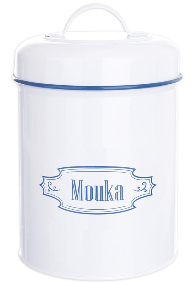 Stylová kulatá plechová dóza s modrým nápisem MOUKA a praktickým víčkem. V krásném retro stylu. V nabídce najdete i další dózy ve stejné edici Blue line. Materiál - plech. Rozměry - průměr 13 cm, výška 20,5 cm.