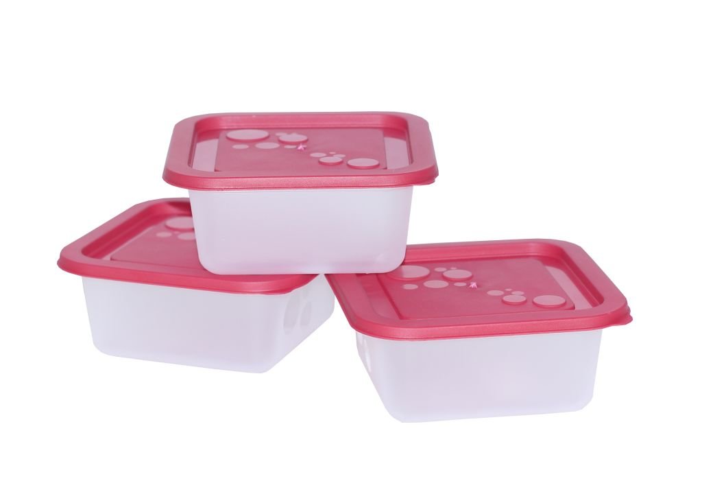 Sada tří plastových dóz s víkem o objemu 550 ml, vhodné k uchování a přepravě potavin nebo drobných předmětů v domácnosti, lze je umístit do mrazáku, myčky i mikrovlnné trouby, rozměry 13 x 13x 5 cm.