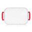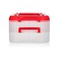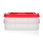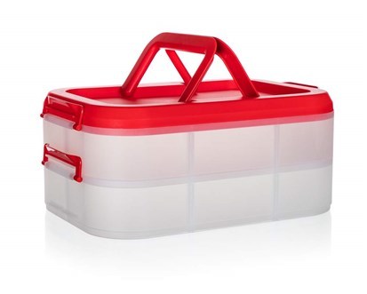 Party box s držadly CULINARIA o rozměru 40 x 28 cm je praktickým a atraktivním pomocníkem v přenášení a úschově jídla. Party box obsahuje 2 úložná transparentní patra, držadla a červené víko.