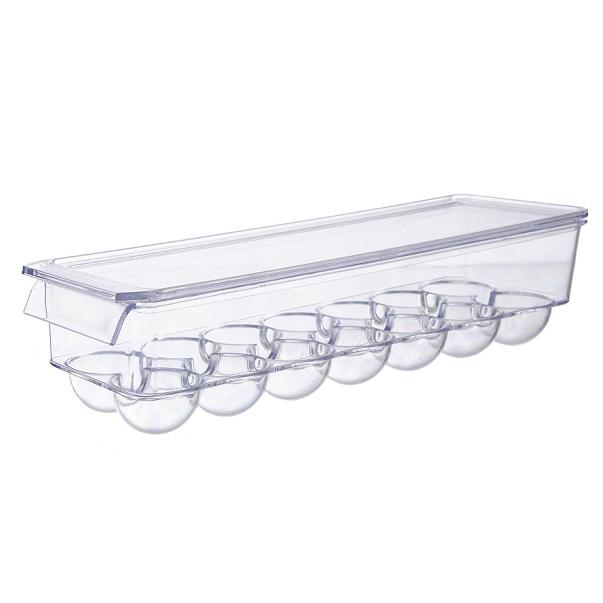 Box s víčkem na uložení 14 ks vajíček pro bezpečnější uložení nebo přenášení. Stohovatelný. Na jedné úzké straně je opatřen držadlem pro snadné vytahování boxu z přihrádky lednice. Materiál: plast PS. Rozměry: 36x10,5x8,5 cm. Pro teploty max. +70 °C. Není vhodný do myčky na nádobí.