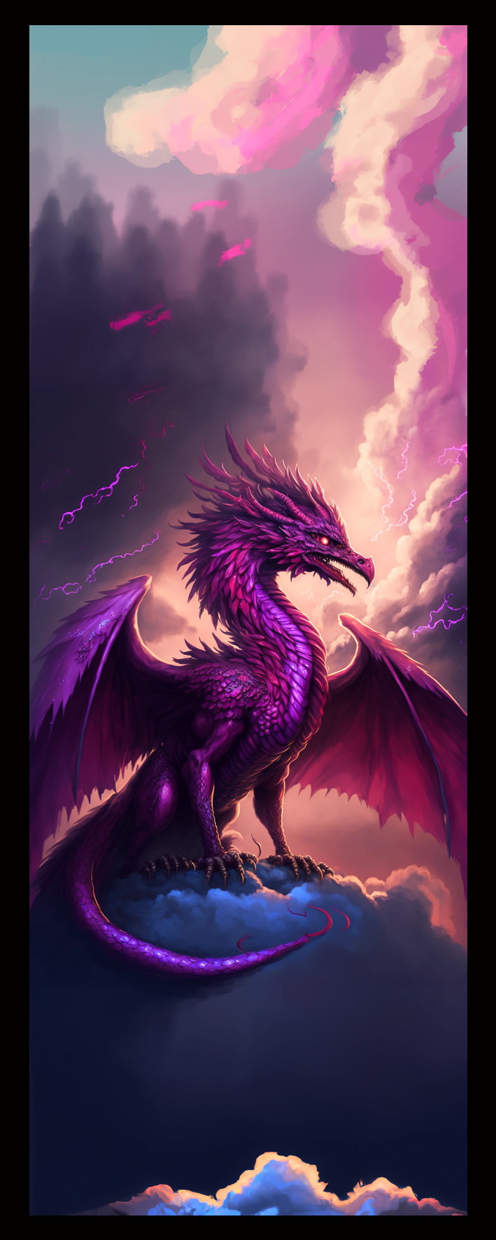 Bouřkový drak, hlavní motiv této záložky, je bytostí z nejvyšších a nejnebezpečnějších vrcholů světa. Jeho ostře fialové šupiny a tmavě růžové chocholy, z nichž jiskří blesky během nebeských bouří, vytvářejí dechberoucí vzhled. Tento fascinující drak je symbolem čisté energie a síly - představuje výzvu i inspiraci pro každého čtenáře, který touží vzlétnout s fantazií do nových výšin.