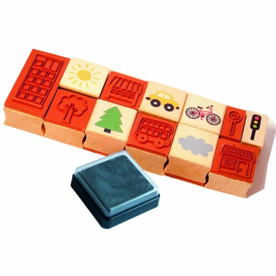 Sada 12 razítek s motivy života ve městě umožní malým výtvarníkům vytvářet originální obrázky ulic města s auty a parky, do kterých např. může domalovat vlastní postavy. Sada 12 dřevěných razítek, inkoustového polštářku a 3 barevných pastelek je uložena v praktickém plastovém pouzdru. Vhodné od 3...