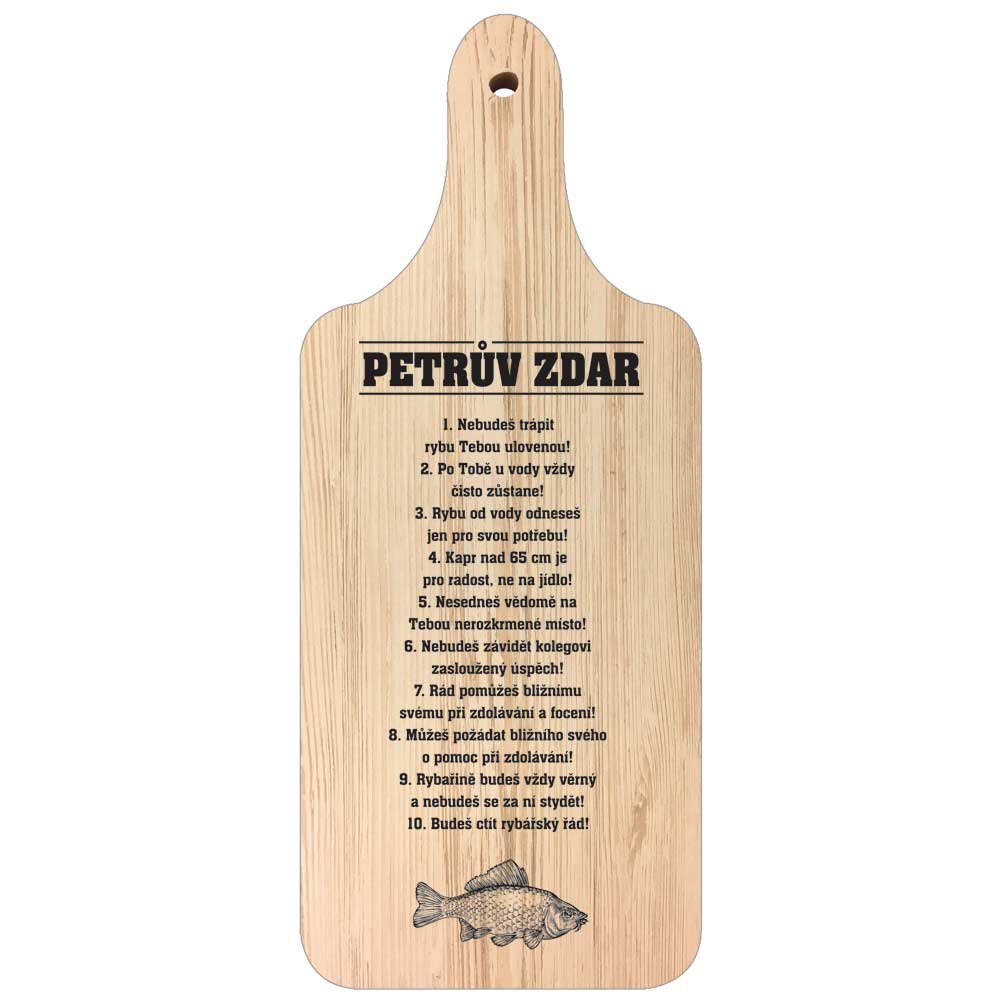 Dekorační prkénko s originálním rybářským potiskem - rybářské desatero Petrův zdar. Krásná dekorace pro váš domov nebo chalupu. Velikost 28 x 12 cm. Prkénko lze i používat z nepotištěné strany.