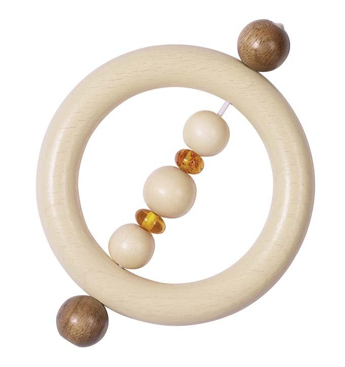 Chrastítko s korálky a pravým jantarem, při pohybu příjemně chrastí.