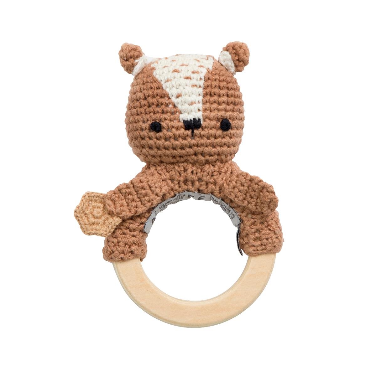Ručně háčkované chrastítko s medvídkem Milem na dřevěném kroužku. Milo je