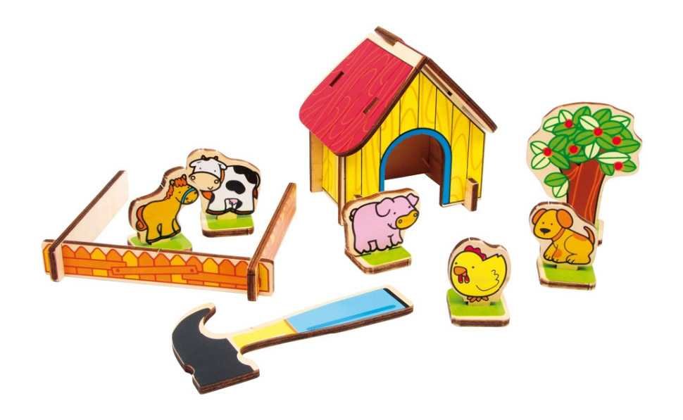Farma se skládá z 5 zvířat, plotu, stromu, stodoly a kladiva. Celkem 22 dílů skládačky.Německá firma Legler zaměřená na výrobu kvalitních dřevěných hraček od roku 1996. Všechny dřevěné hračky značky small foot mají označení CE a jsou vyráběny dle evropské normy pro bezpečnost hraček EN 71. Použité barvy jsou speciálně vyvinuty pro dřevěné hračky a jsou odolné i proti slinám dětí. Dřevo, které se používá pro tyto hračky, většinou pochází z lesnických společností zapojených do zalesňování. To nabízí všem zákazníkům možnost přispět k zachování přirozeně rostoucích lesů. Dřevěné hračky small foot jsou zářivě barevné produkty, které jsou vyrobeny převážně z přírodních surovin - dřeva. Dětem dělají radost od útlého věku, rozvíjí jejich hmatové a smyslové dovednosti. Cílem značky small foot je podporovat duševní a fyzický vývoj dětí.