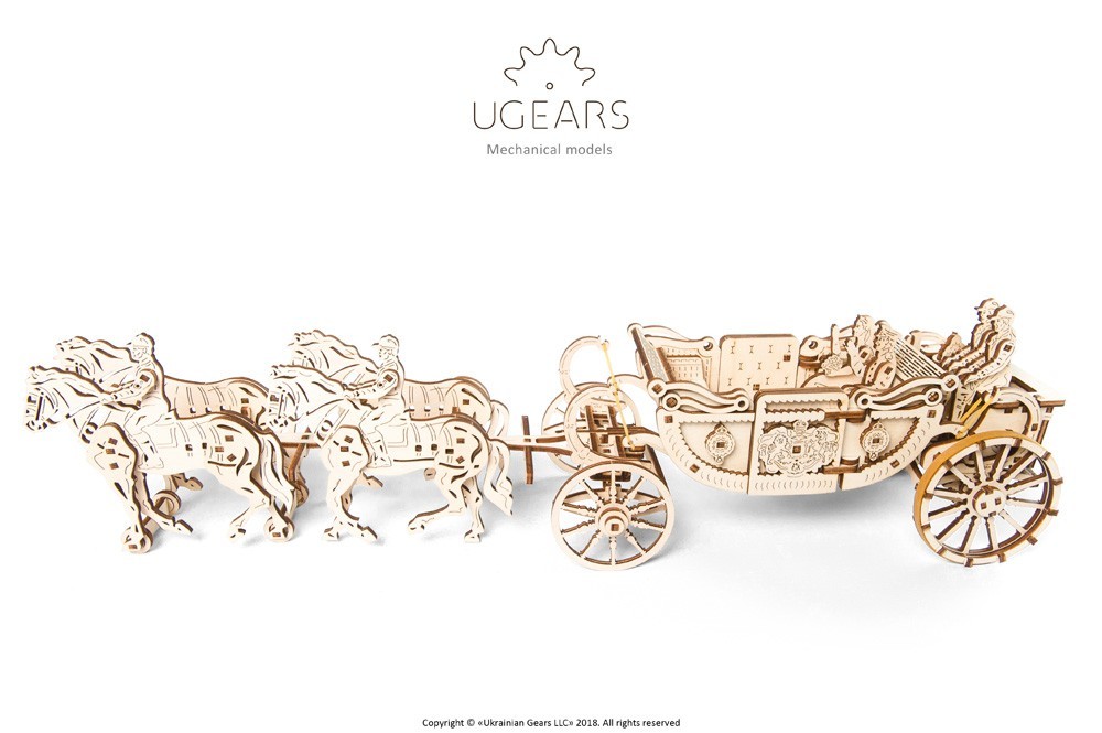 Ugears Dřevěná stavebnice 3D mechanické puzzle Královský kočárSložitý a elegantní kočár, inspirovaný Státním Landauem z roku 1902, táhnou čtyři ladní koně. Návrháři společnosti Ugears věnují zvláštní pozornost detailům modelu: sedadla v prostoru pro cestující napodobují měkkou kůži, kočí nosí své nejkrásnější kabáty a královský znak je laserově leptán na panelech dveří. Dveře se zamykají v otevřené nebo zavřené poloze. Pružné pásy s gumovými pásy dělají design vozu ještě realističtějším. Model je poháněn malým a kompaktním gumovým pásovým motorem, který lze snadno sestavit. Chytrá konstrukce vozíku umožňuje sledovat fungování mechanismu skrz vyřezávané tělo modelu. Navíjecí klíč má tvar královského znaku, ale je na něm vyryté logo Ugears. Navzdory malému motoru může plně navinutý (20-25 půl otáček klíče vinutí) pokrýt až 4 metry. To je možné díky mechanismu s volnoběžkou, který zajišťuje, že se model po určitou dobu pohybuje i poté, co motor skončil svou práci.