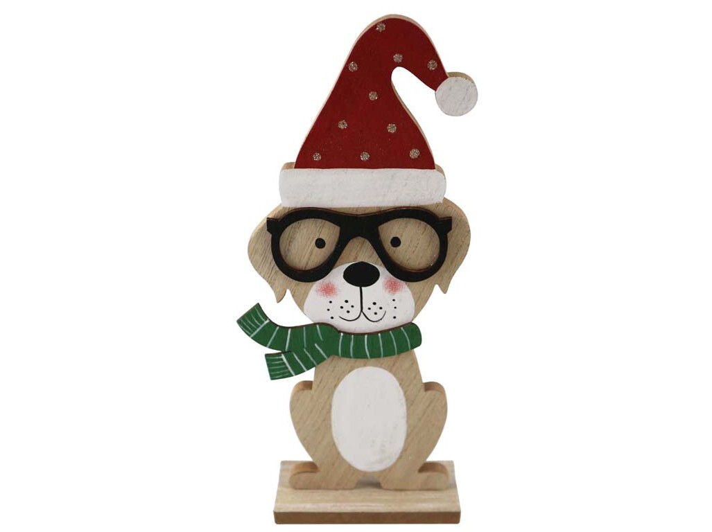 Dekorace dřevo 120×310 mm pes s brýlemi a Santovskou čepicí na postavení, přírodní, barevná