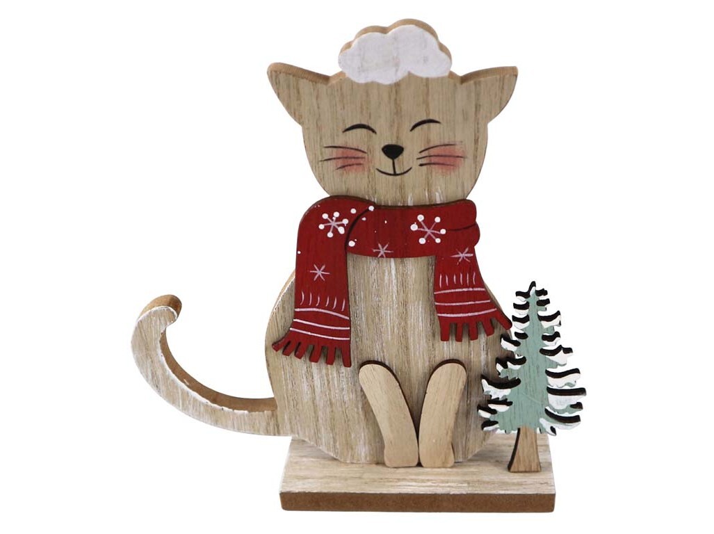 Dekorace dřevo 185x205mm, kočka na postavení, přírodní, červená
