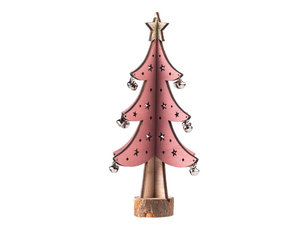 Dekorace dřevo 135x240mm,stromek na postavení s rolničkamii, růžová