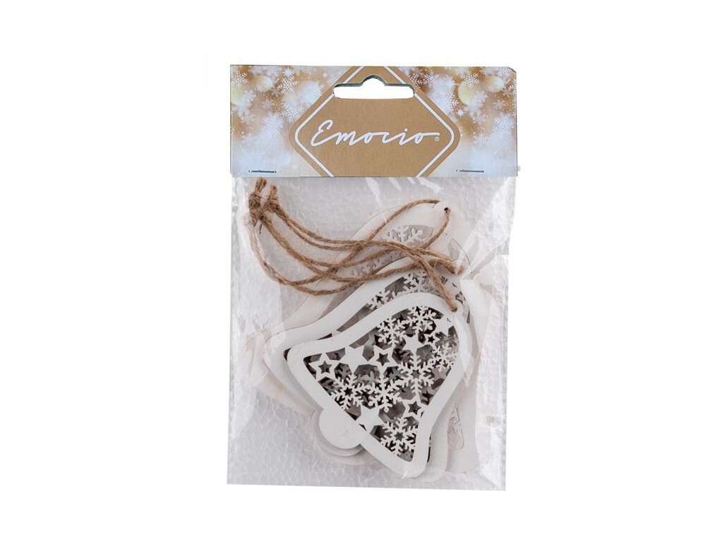 Závěs dřevo 3 ks 110x120/90x100/75x80mm zvoneček uvnitř vločky, hvězdy, bílá