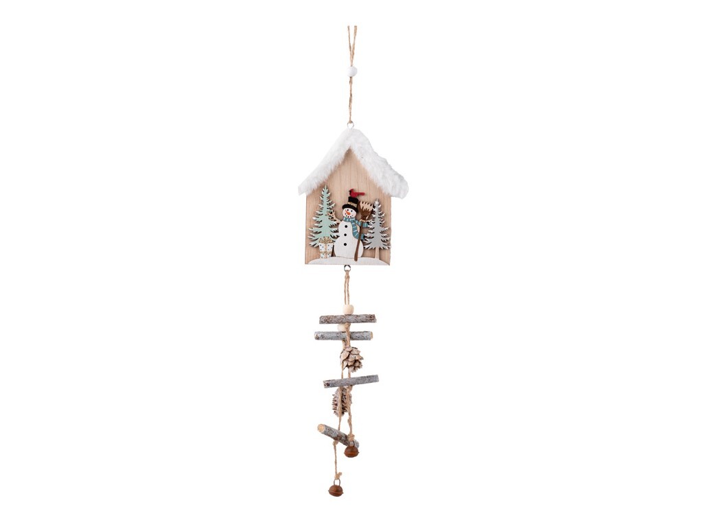 Závěs dřevo 100x120mm domeček se sněhulákem, přírodní, barevná