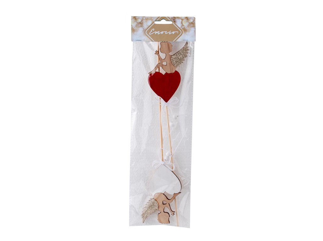 Zápich dřevo 2ks 75x100mm + špejle Anděl sedící na srdíčku, přírodní s glitrem, červená,bílá
