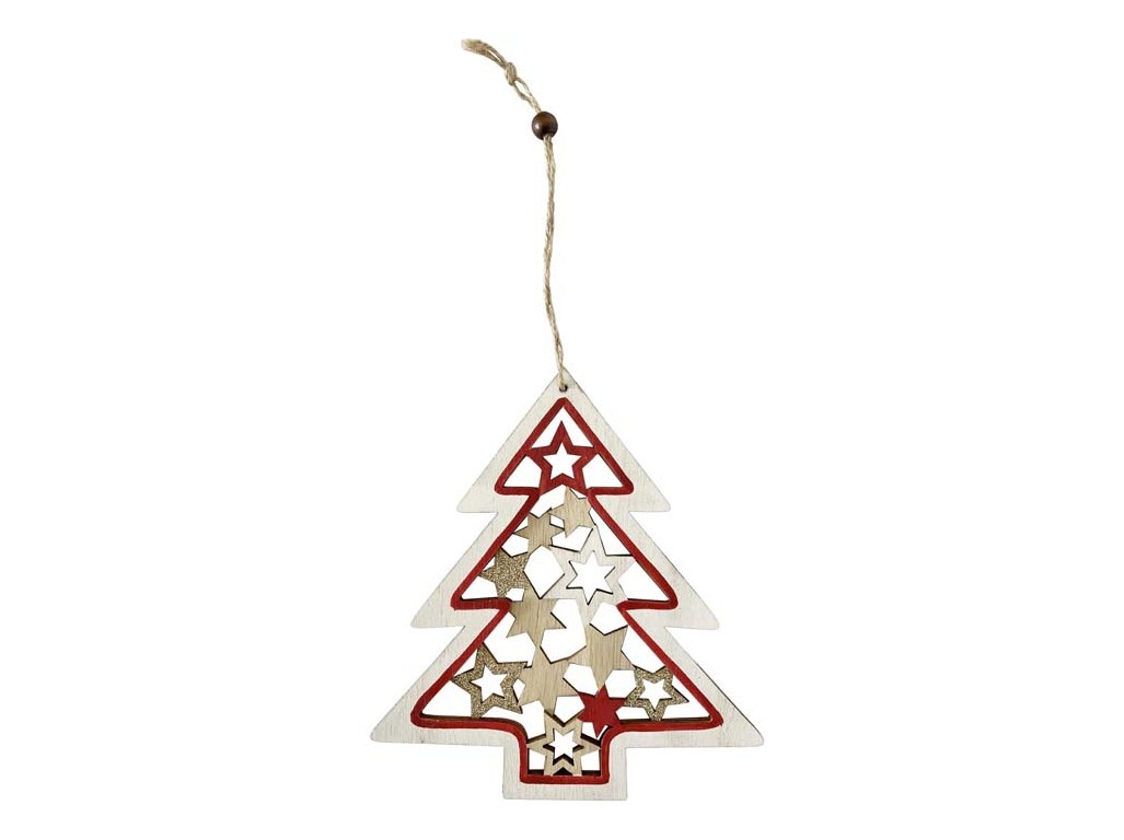 Závěs dřevo 155X170mm stromek s hvězdičkami, přírodní s glitrem, bílá, červená