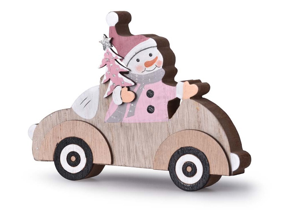 Dekorace dřevo 150x115mm autíčko&sněhulák, přírodní, bílá, růžová