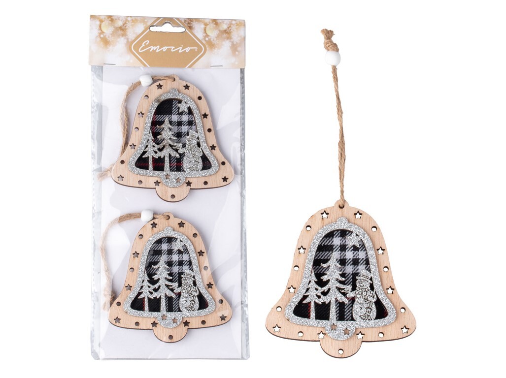 Závěs dřevo 2 ks 95X100mm zvonek, přírodní s glitrem, stříbrná