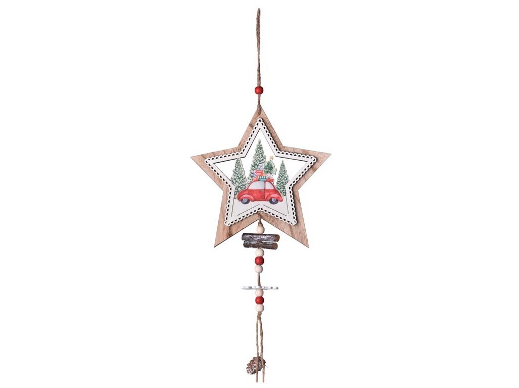 Závěs dřevo 170x180mm hvězda s motivem auta a dárečku, přírodní+mix barev