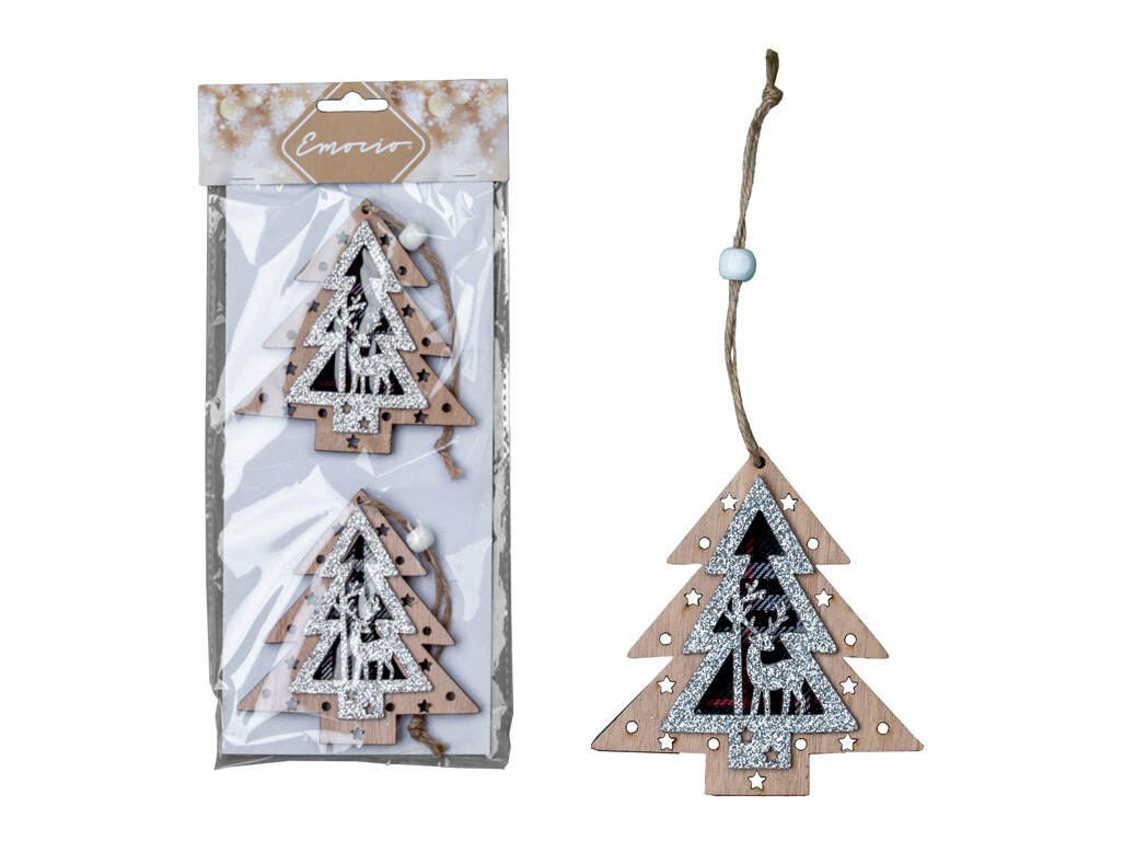 Závěs dřevo 2 ks 95x100mm stromek, přírodní s glitrem, stříbrná