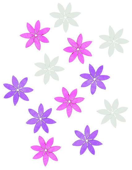 Dřevěné kytky v odstínech růžové, fialové a bílé jsou určeny k vytváření dekorací. číst celé