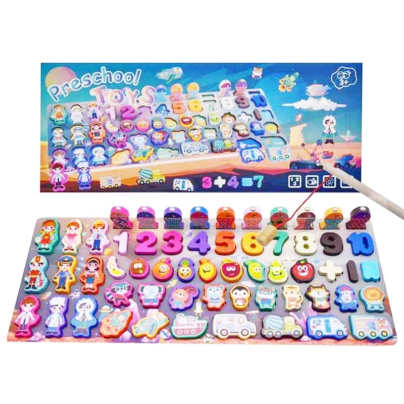 Naučná dřevěná hra, má rozměry 45x18 cm. Vhodné také jako pomůcka k procvičení angličtiny. Balení obsahuje barevné rybičky s čísly, udici, čísla, postavičky představující jednotlivé povolání, zvířátka a ovoce ke vkládání. Cena je za balení. Nevhodné pro děti do 3 let.