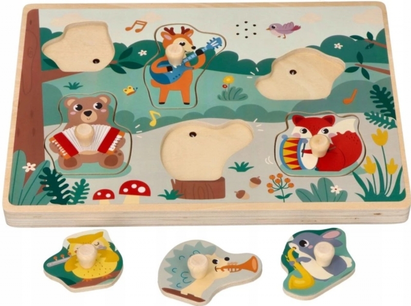 Puzzle je vyrobeno z přírodního dřeva, skládá se ze základny a 6 zvířat, která hrají na různé nástroje.