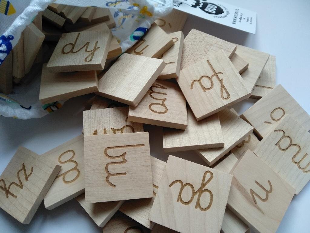 - 91 sztuk tafelków z wygrawerowanymi sylabami (czcionka elementarz);