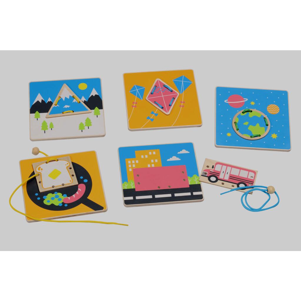 CHILD FRIEND Tvary je navlékací hra, která obsahuje základní desky, díly různých tvarů a bavlněné provázky. Cílem hry je pomocí bavlněného provázku spojit dřevěný díl odpovídajícího tvaru se správnou základní deskou. Různé druhy scén rozvíjejí dětskou představivost, děti při navlékání procvičují jemnou motoriku, koordinaci oko-ruka, učí se základním geometrickým tvarům, soustředění.
