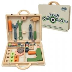 Drewniana walizka z narzędziami W zestawie (31 elem.): młotek, śrubokręt, klucz nasadowy, klucz francuski, wkrętarka, śrubki i nakładki, kombinerki, koła zębate Wymiary opakowania: 30 x 6 x 26 cm Wiek 3+