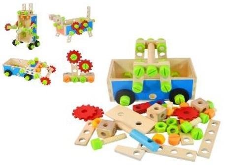 W zestawie: skrzynka na elementy, zestaw elementów konstrukcyjnych w tym koła zębate, deseczki, nakrętki, śrubki, śrubokręty. číst celé