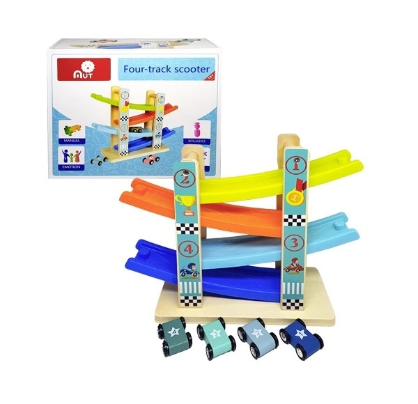 Dřevěná dráha s autíčky je 24 cm vysoká, v balení se 4 autíčky. číst celé