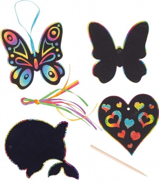 - Balení obsahuje: 1 dřevěné škrabátko, barevné pentle a 4 šablony obrázků.