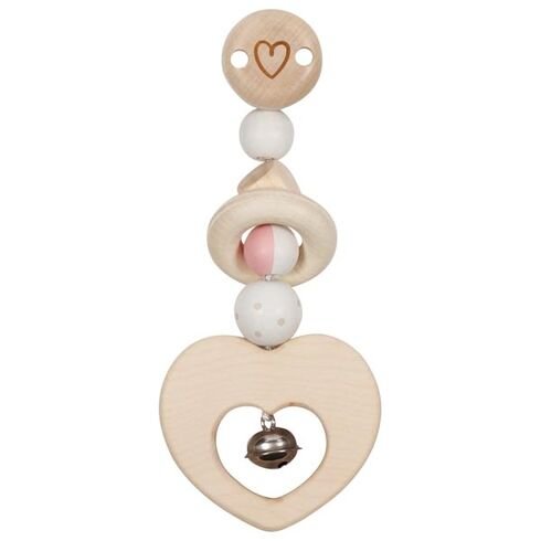 Krásný dřevěný klip s motivem srdce a rolničkou, vydávající příjemný zvuk, zaujme všechna malá aktivní miminka.