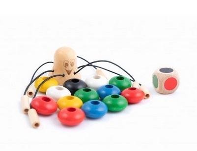 - drewnianą kostkę z kolorowymi kropkami;