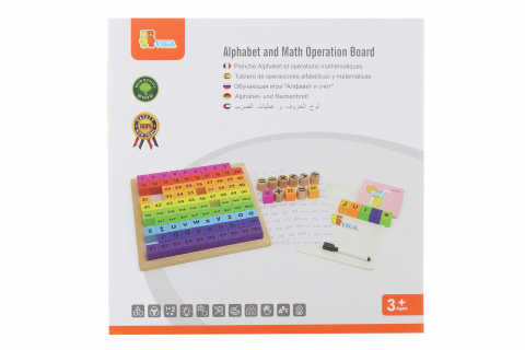 Dřevěná hra Abeceda a matematika. Sada obsahuje 100 kostiček v deseti barvách, 8 válcových kostek, 2 velké papírové karty, 13 malých papírových karet, látkový pytlík a pero. Rozměry balení cca 30 x 30 x 4,5 cm. Věk 3+