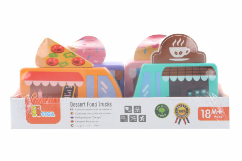 Dřevěná potravinová auta. Balení obsahuje 4 auta - každé o velikosti cca 10 x 8,5 cm. Rozměry balení cca 21 x 9,5 x 12 cm. Věk 18m+