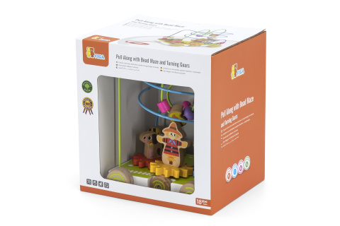 Dřevěný labyrint na kolečkách o rozměru cca 20,5 x 25 x 19,5 cm. Součástí labyrintu i ozubená kolečka,která se při pohybu točí.Součástí š`ńůrka na tahání.Rozměr balení cca 24 x 25,5 x 19 cm. Věk 18 měs+ číst celé