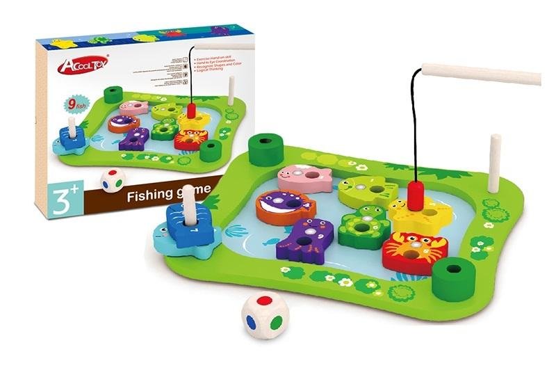W zestawie: podstawa/staw 28,5 x 23 x 0,5 cm. Z palikami, 9 zwierzątek morskich, 2 wędki, kostka, gra dla 2 graczy, zasady gry: rzuć kostką i wyłów rybkę w kolorze, który wypadnie , jeśli w stawie nie ma już rybki w wylosowanym kolorze, kolejka przechodzi na kolejnego gracza, wygrywa ten kto złowi więcej rybek i umieści je na paliku, wym. Opk: 29,5 x 24,5 x 4,6 cm., 3+