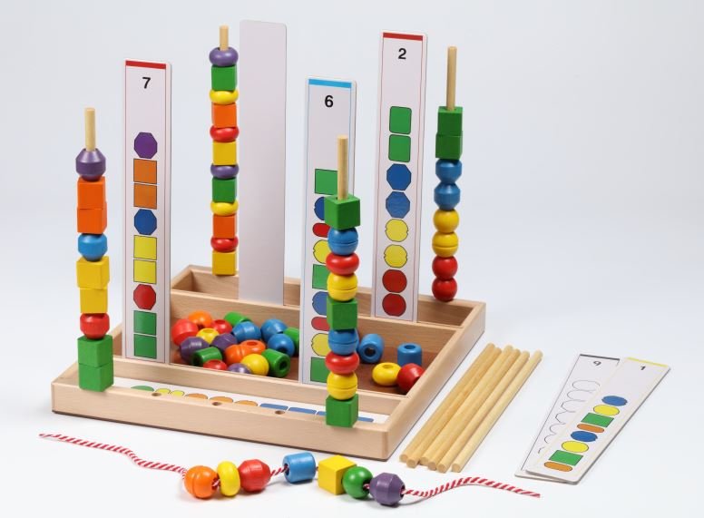 Dřevěná krabička, 72 dřevěných korálků, 10 dřevěných tyček, 10 výukových karet, 1 provázek. Cílem je navlékat korálky na tyčku či provázek dle vzorové karty, aby souhlasila jak barva, tak tvar.