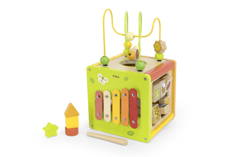Veselá dřevěná kostka s aktivitami.Obsahuje vkládačku,labyrint, bludiště, xylofon otáčecí prvky Rozměry 18x20x32 cm. Rozměry balení 22x19x20 cm. Věk 18m+