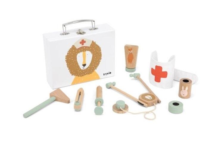 Dzięki temu zabawnemu Zestawowi Małego Lekarza dzieci będą mogły bawić się w lekarza ze swoimi lalkami, pluszakami, przyjaciółmi i rodzicami. Mali i duzi pacjenci w mgnieniu oka poczują się lepiej! W zestawie znajduje się strzykawka, stetoskop, termometr, młoteczek, opaska pielęgniarska i inne akcesoria. Wszystkie elementy mieszczą się w praktycznej lekarskiej walizeczce z metalowym zamknięciem, udekorowanej wesołym zwierzakiem. Zabawa zestawem lekarskim może skutecznie oswoić dzieci z badaniami, zanim pójdą na prawdziwą wizytę lekarską. Zestaw małego lekarza marki Trixie Baby wykonany jest z najwyższej jakości drewna bukowego, co przekłada się na bezpieczeństwo dzieci i przyjazność dla środowiska. Wiek: 3+