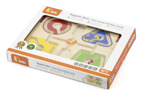 Dřevěná magnetická hra-labyrint. Pomocí magnetického pera se posouvají kuličky v labyrintu. Rozvíjí dětskou zručnost a učí barvy. Rozměry balení cca 31x24x4 cm. Věk 18m+ číst celé