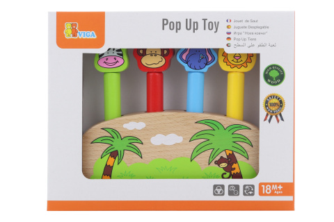 Dřevěná hra zvířátka. Po zmáčknutí zvířátka, zvířátko vyskočí. Rozměry cca 16,5 x 14 x 4,2 cm. Rozměry balení cca 21 x 17 x 5 cm. Věk 18m+