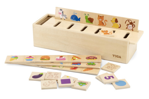 Dřevěná hra třídění. Pěkná a kvalitní krabička s 6 sloty na odnímatelném víku obsahuje 4 dlouhé desky a 48 ks dřevěných bloků s kategoriemi zeleniny, ovoce, dopravy, tvarů, zvířat a čísel. Položte jednu z desek na víko, najděte odpovídající obrázek a vložte jej do správného slotu. Rozměry cca...