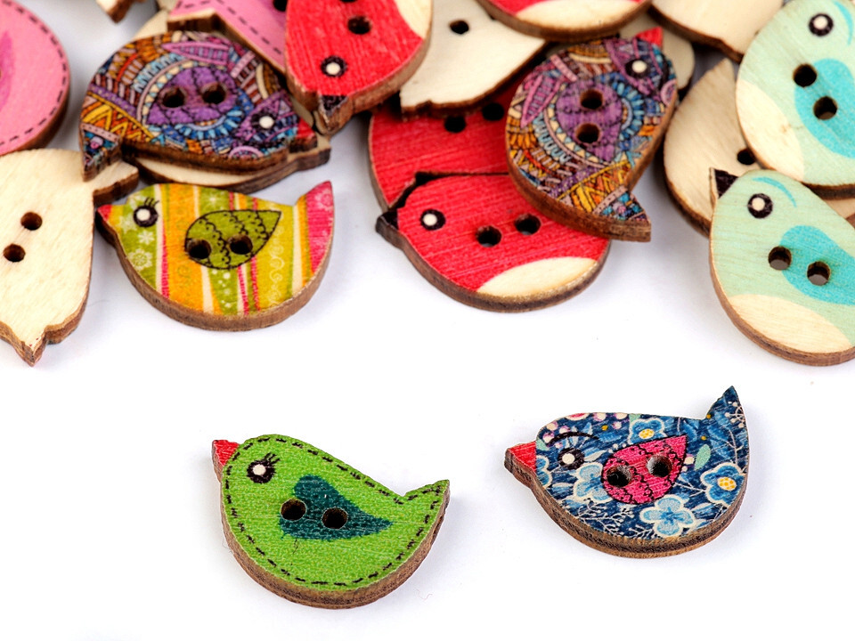 Dřevěný dekorační knoflík ptáček - 50 ks - mix