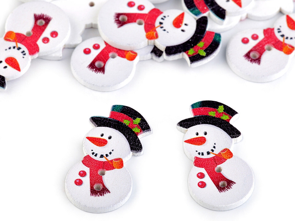 Dřevěné dekorační knoflíky v podobě sněhuláka jsou roztomilou zimní dekorací. Knoflíky využijete k aranžování např. svátečního stolu. Můžete je nalepit na dřevěné kolíčky. Využijete je také ve scrapbookingu, kde s nimi můžete ozdobit rámečky, přáníčka, jmenovky, pozvánky, deníky apod. Motiv je jednostranný, z druhé strany jsou knoflíky bílé. Knoflíky jsou balené v sáčku. Nedoporučujeme je prát.