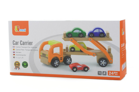 Dřevěný tahač se čtyřmi autíčky. Rozměry auta cca 28,5 x 14,5 x 8 cm. Rozměry balení cca 31 x 15,5 x 9 cm. Věk 2+