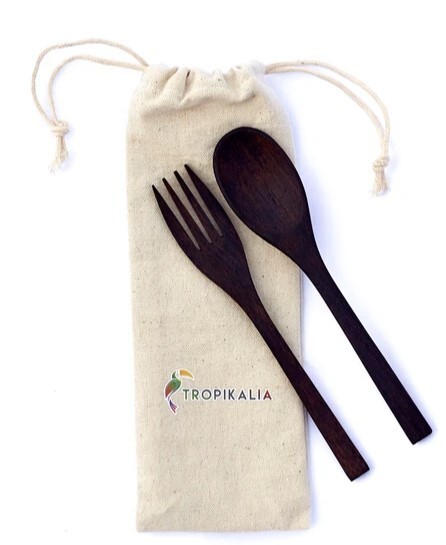 Cestovní set obsahuje lžičku a vidličku z kokosového nebo ebenového dřeva (dle výběru) a plátěný obal.